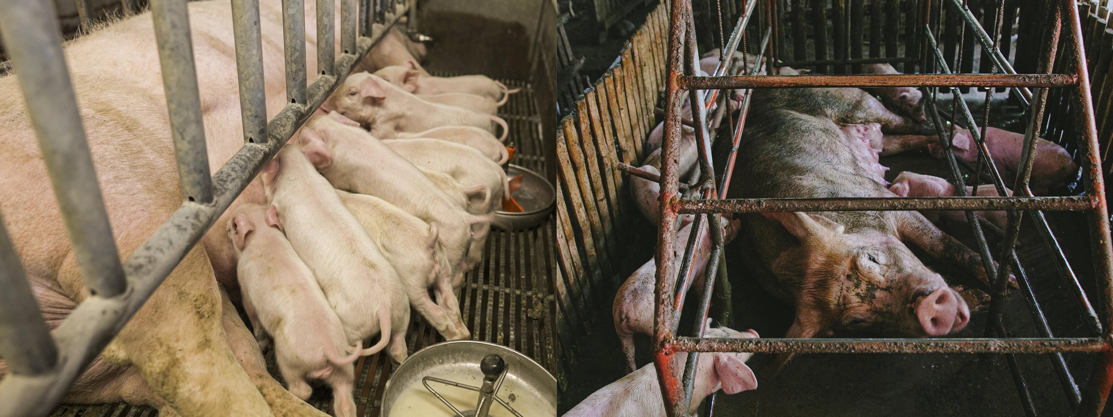 Farrowing crates are actually smaller than sow stalls, restricting the sow from interacting with her young in the name of increasing piglet survival for overall profit.