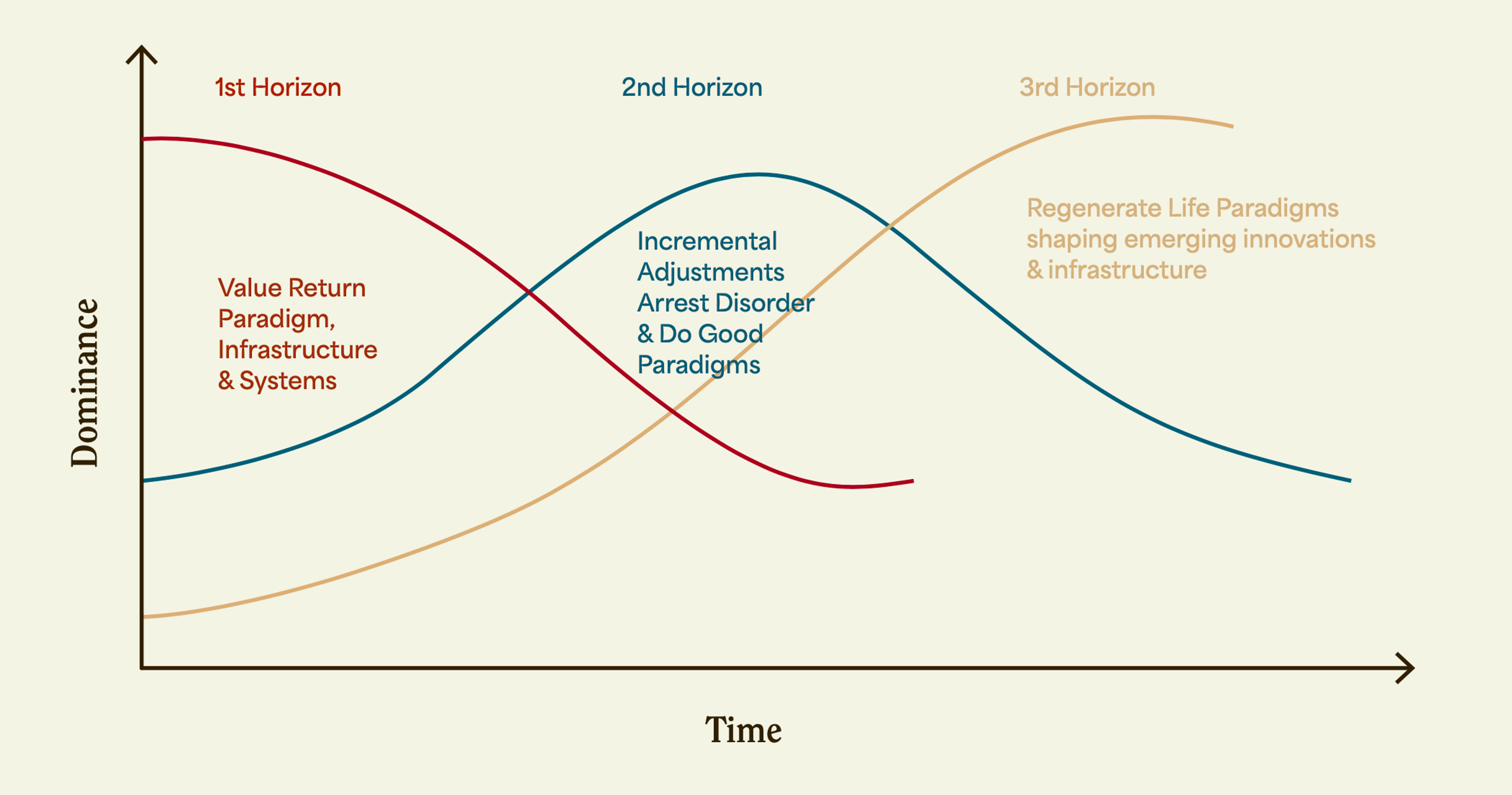 To understand where we sit currently in investment flows and transformative shifts, we have merged the 4 Levels of Paradigm with the 3 Horizons Framework — developed by the International Futures Forum as a tool 'for making sense of and facilitating cultural transformation and exploring innovation and wise action in the face of uncertainty and not-knowing’ (Wahl 2016).
