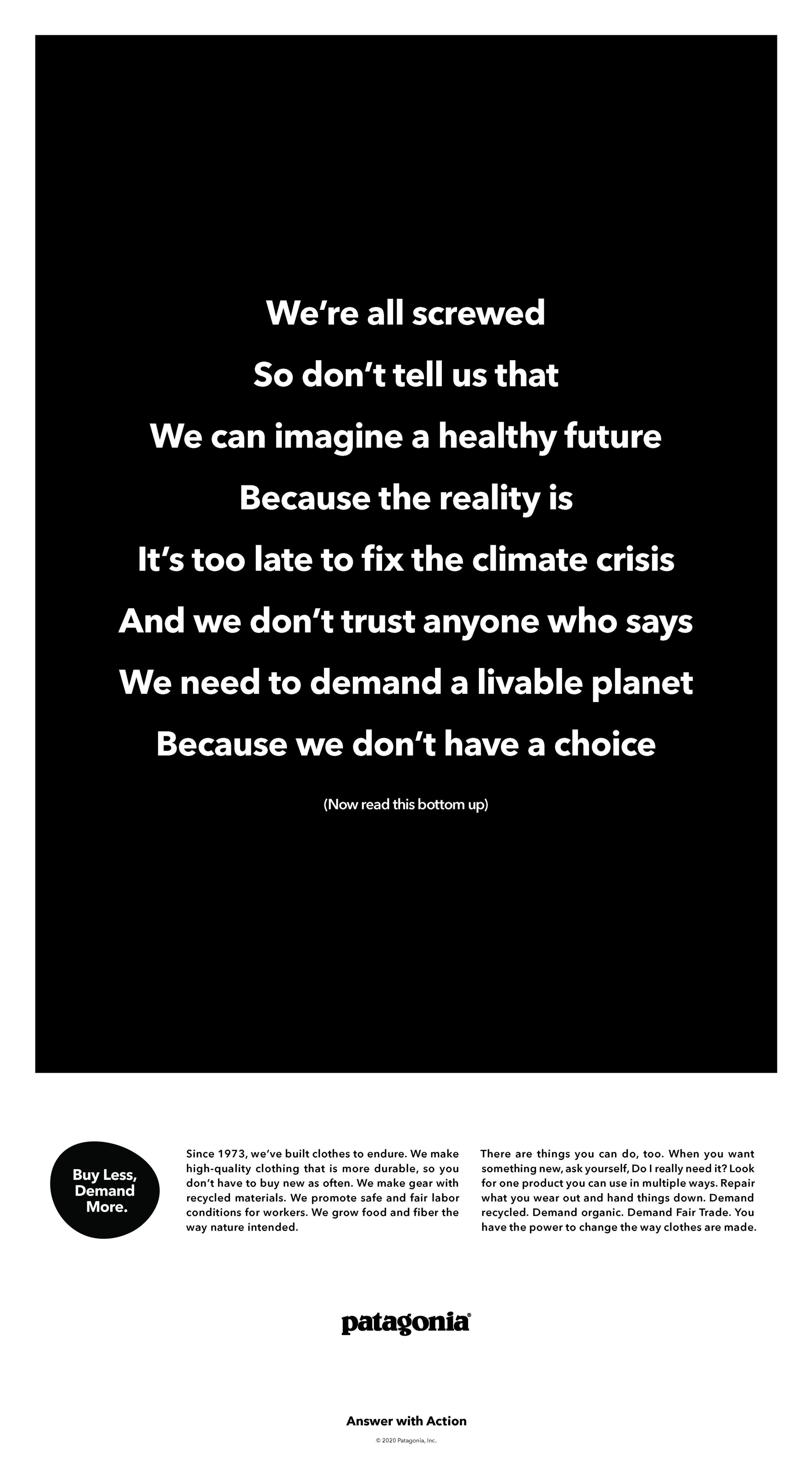 Patagonia uses their storytelling platforms for bold and provocative messaging that invites customers to challenge the status quo. With its now famous ' Buy Less, Demand More' anti-Black Friday campaign, the company doesn't go on sale for Black Friday or Cyber Monday and instead powers down on provocative storytelling across its platforms to deliver some hard-hitting home truths about the impact of mass consumption on planet earth.